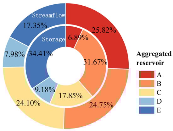 b. The aggregated reservoirs with highly controlled streamflow, large storage capacity, and geographical location in the uppermost reaches of the entire reservoir system could contribute substantially to the synergistic revenue in energy production. In particular, reservoirs A and B control the most (25.82%) and second most (24.76%) streamflow to the total inflow of the downstream reservoirs, while the storage capacity of the two reservoirs accounts for 38.56% of the total storage capacity of all the aggregated reservoirs, thereby contributing most to the synergistic revenue in energy production. Moreover, aggregated reservoirs A and B are in the most upstream position within the entire reservoir system. This means that the two aggregated reservoirs can fully regulate the inflow process from the most upstream compensated reservoirs to the downstream, thereby greatly affecting the inflow and synergistic revenue in energy production of the downstream reservoirs.