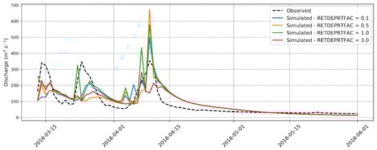 In the WRF-Hydro modeling system, it is generally expected that surface runoff, and consequently, discharge should decrease with an increase in RETDEPRTFAC. This trend was not consistently observed except for the highest value, RETDEPRTFAC = 3, which displayed the lowest PBIAS index (−2.60), indicating the only underestimation of the simulated data relative to the observed data.