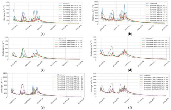 Just as in the study conducted in the Upper Trinity River Basin, located in North-Central Texas, USA [48], infiltration processes were more sensitive to REFKDT and OVROUGHRTFAC. Consequently, significantly altering the discharge data at certain OVROUGHRTFAC values changes the shape of the hydrographs in these cases, showing peak discharges at separate times and values. At the maximum point of the observed simulations, for example, around 10 April 2018, the discharge is greater when OVROUGHRTFAC is 0.1 than when this parameter is 0.5, which in turn is greater when OVROUGHRTFAC = 0.8. Table 4 shows the statistical coefficients for all parameters.