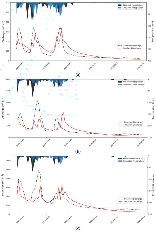 It can be observed that the simulated precipitation in the observed data presented in Figure 9b,c is underestimated, while Figure 9a exhibits a seemingly smaller overestimation. It is also noteworthy that the inherent uncertainty in climate predictions resulting from the WRF simulation, conducted with GDAS-FNL input data, has impacted the results of the WRF-Hydro simulation. Table 8 displays the relative errors of accumulated simulated and observed rainfall events within the drainage networks of the three analyzed rivers.