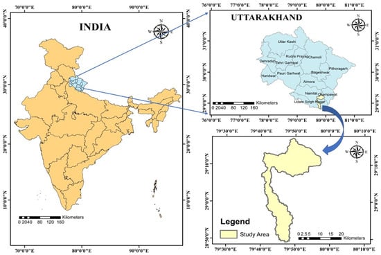 The Nandhour-Kailash River watershed, located in the Kumaon region of Uttarakhand, has an area of 474.094 km2 and a perimeter of 276.207 km. The location and spread of the Nandhour-Kailash River watershed are shown in Figure 1. It lies in the Tarai and Bhabhar regions of Udham Singh Nagar district and the hilly region of the Nainital and Champawat districts. The Nandhour-Kailash River originates from the Kundal River Forest in the Champawat district. The study area is situated between longitudes and latitudes in the Udham Singh Nagar (78°45′ E–80°08′ E and 28°53′ N–29°23′ N), Nainital (79°27′ E–29°22′ N), and Champawat (80°05′ E–29°20′ N) districts of Uttarakhand. The district comprises seven developmental blocks and seven tehsils, including Japsur, Kashipur, Bazpur, Gadarpur, Rudrapur, Sitargunj, and Khatima, with Rudrapur serving as the district’s administrative center.
