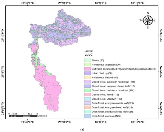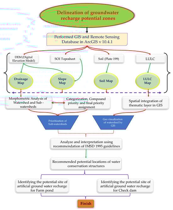 The Nandhour-Kailash River Watershed study area boundaries were determined using topographic sheets, digital elevation models (DEMs), soil and land use, and land cover (LULC) data sourced from multiple organizations, including the Survey of India (SOI) in Dehradun, Uttarakhand, Alaska Satellite Facility (ASF), National Atlas and Thematic Mapping Organization under the Department of Science and Technology, Government of India, and the United Nations (UN) and Food and Agriculture Organization (FAO). Topographic maps, satellite images, and other reference maps acquired from various sources were used to prepare the LULC characteristics. The data sources used for mapping groundwater potential are shown in Table S1. The study used ArcGIS v10.4.1 to produce and project maps, gather geospatial data, assess mapped data, share and discover geographic data, use maps and geographic data in various applications, and manage geographic data in a database. Figure 2 depicts the methodological flowchart for delineating the Nandhour-Kailash River Watershed. Identifying an appropriate potential zone for artificial groundwater recharge is a wide range of multi-objective and multi-criteria problems. The step-by-step procedure for delineating watersheds and sub-watersheds is shown in Figure 3a.