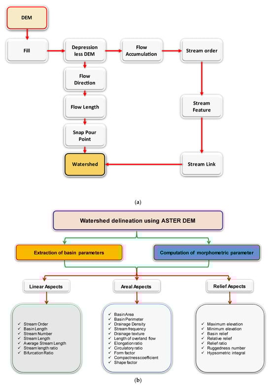 Flow chart of (a) delineation of the watershed and (b) morphometric parameter analysis.