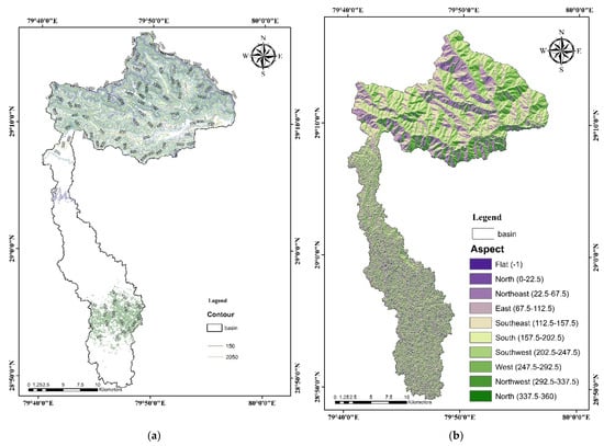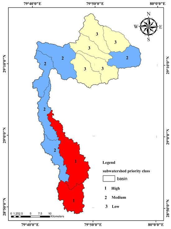 Understanding the morphological features of a catchment area is crucial to understanding the hydrological processes and putting mitigation measures in place [62]. Bali et al. [63] used morphometrics to study the morphology of upper Himalayan zones (now categorized as hydrologic mechanisms). This technique helps understand glacial–fluvial landform development. Linear characteristics for each sub-watershed include stream order, basin length, stream number, average stream length, stream length ratio, and bifurcation ratio. Area characteristics include basin area, perimeter, drainage density, stream frequency, drainage texture, length of overland flow, elongation ratio, circulatory ratio, compactness coefficient, and shape factor. Relief metrics involve maximum and minimum elevation, basin relief, relief ratio, relative relief, ruggedness number, and hypsometric integral. A visual representation of the prioritization methodology for sub-watersheds in the Nandhour-Kailash River Watershed can be found in Figure 3b.