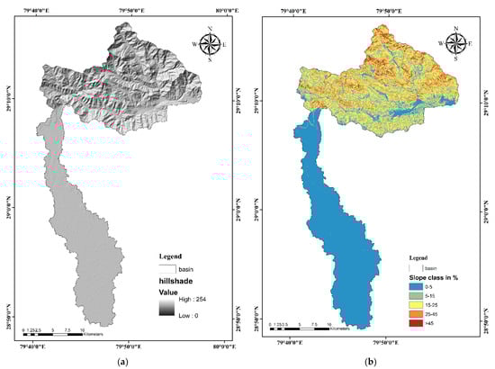 Relative relief aims to determine the amplitude of available relief related to the altitude of a given area’s highest and lowest points [78]. It denotes the difference between a spatial unit’s highest and lowest points. It is critical to comprehend the watershed’s denudational characteristics, degree of dissection, and terrain’s morphological characteristics. These parameters control the stream gradient and, thus, influence the flood pattern [79]. It can be expressed as: