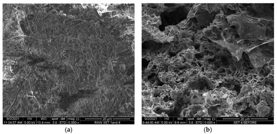 At a magnification of 5000× in the SEM images of the precursor materials and the LSDPFAC, the surface of the precursor was seen to be rough and dense and contained no pores The magnification level of the SEM images of the precursor and LSDPFAC was 5000× (Figure 1). The pores in the LSDPFAC were initially occupied by the typical components of lignocellulosic materials, such as cellulose, hemicellulose and lignin [], which were subsequently removed, which resulted in the formation of the network of pores in the LSDPFAC.
