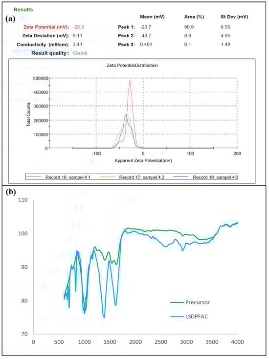 Zeta potential of LSDPFAC (a) and FTIR spectra of precursor materials and LSDPFAC (b).