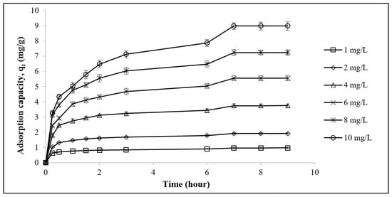 The effect of the contact duration at various concentrations on the adsorption of Pb2+ is shown in Figure 3. The Pb2+ adsorption uptake values increased as its concentration increased in the solution. At higher Pb2+ concentrations, more Pb2+ ions were available for absorption by the LSDPFAC, indicating a greater adsorption of Pb2+ with greater concentrations of Pb2+.