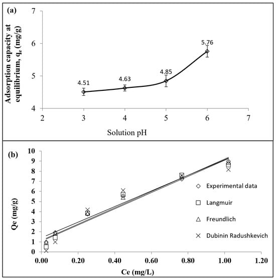 Plots of Pb2+ adsorption uptakes by LSDPFAC versus solution pH at 30 °C (10 mg/L concentration, 0.2 g adsorbent dosage and 200 mL of solution) (a) and plots of isotherm models for Pb2+–LSDLFAC adsorption system at 30 °C (b).