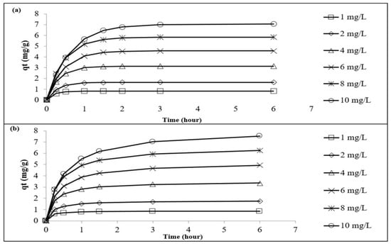 The same procedure as that used for the equilibrium study was performed in the kinetic study, except that in the kinetic study, the concentrations of Pb2+ were determined at a pre-determined time between 0 to 180 min. The two most popular kinetic models, i.e., the pseudo-first-order (PFO) [] (Equation (9)) and pseudo-second-order (PSO) [] (Equation (10)) models, were both applied as follows: