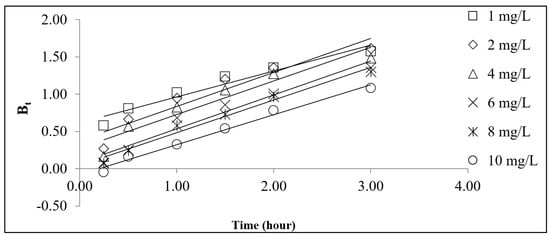 The kinetics of the adsorption of Pb2+ onto the LSDPFAC was best described by the PSO model (Figure 5a,b). The RMSE value of the PSO model of 0.14 was less than that of the PFO model, which was 0.30 (Table S1). The adsorption of Pb2+ by AC produced from cigarette waste [] and by AC derived from mangosteen peel [] were also best described by the PSO model. A consistent decreasing trend was observed in the k2 values (from 0.1735 to 0.0043 g mg−1 min−1) as the initial Pb2+ concentration increased from 1 to 10 mg/L. At greater concentrations of Pb2+, the presence of many Pb2+ ions in the solution created a lot of competition for the adsorption process to occur. In order to understand the mechanism of the adsorption process better, the Boyd plot was constructed and is given in Figure 6. All the lines in the Boyd plots were noted to not pass through the origin point. Therefore, it can be concluded that the rate-determining step in the adsorption process was the film diffusion mechanism []. For comparison purposes between this study and other studies, Table 4 provides a summary of the data of Pb2+ adsorption systems with different types of adsorbents.