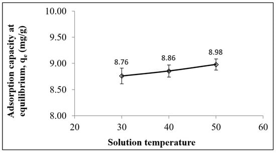 The thermodynamic nature of the adsorption process can be evaluated by conducting the adsorption process at various temperatures (Figure 7) (Table S2). For instance, when the solution temperature increased from 30 to 50 °C, the adsorption of Pb2+ increased from 8.76 to 8.98 mg/g, which indicated an endothermic adsorption of Pb2+ by the LSDPFAC (Figure 7), which was consistent with the positive value of ΔH° of 6.39 kJ/mol. Similarly, the adsorptions of Cu2+, Pb2+, Cd2+ and Zn2+ ions by an AC-supported silver–silica nanocomposite were all endothermic []. The positive ΔS° value of 0.12 kJ/mol K indicated an increment of randomness at the liquid–solid interface. The value of Ea, which was 15.90 kJ/mol, was less than 40 kJ/mol, suggesting that the adsorption of Pb2+ by the LSDPFAC was physically governed []. The negative ΔG° values of −31.28, −32.53 and −33.77 kJ/mol at temperatures of 303.15, 313.15 and 323.15 K, respectively, indicate that the adsorption of Pb2+ onto the LSDPFAC occurred in a spontaneous manner at all temperatures.