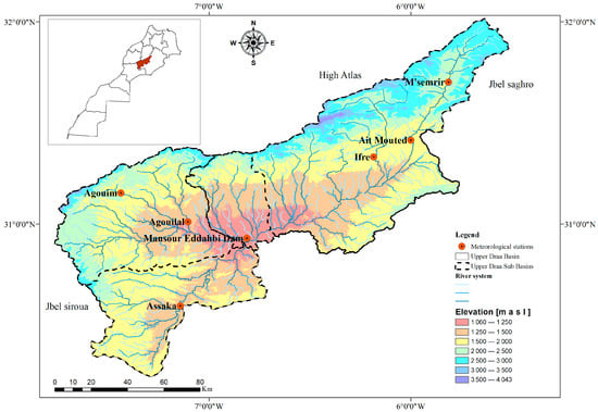 Geographical location, river system, and elevation of the Upper Draa Basin.