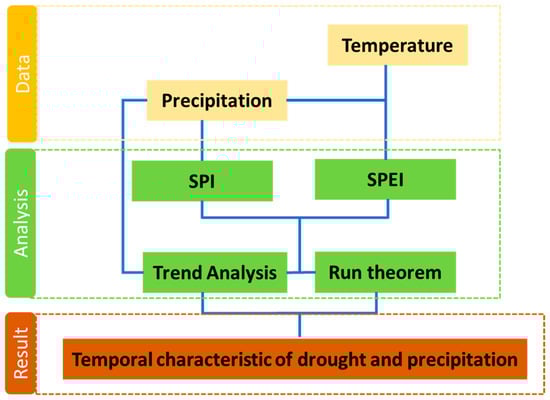 As presented in Table 1, a drought event is considered any time the SPI or SPEI value is equal to or less than −1 and ends when the index value rises above this threshold []. Consequently, the drought basic attributes, i.e., duration, frequency, and severity, were identified using Run Theory (Figure 2). Drought duration was defined as the time when the index value is below the −1 threshold value, and drought severity was defined as a cumulative index value below −1 during the duration of the drought episode, whereas drought intensity was described as a ratio of drought magnitude to its duration.