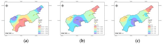 The climate of any region is determined by the long-term mean of weather variables, notably temperature and precipitation. Therefore, we describe the climatology of rainfall as well as the maximum and minimum temperatures over the period of study (Figure 3). Figure 3a shows the spatial distribution of rainfall climatology averaged over the study period. The results indicate that rainfall has the largest magnitude over the M’semrir and Agouim (>218 mm/pa) and the lowest in the Agouilal, Mansour Eddahbi Dam, and Assaka subregions (104 mm–134 mm/pa). Ifre and Ait Mouted receive an annual rainfall of 150 mm −190 mm/pa. The difference in annual precipitation may be attributed to local geographical factors, especially the variation in elevation between the High Atlas and Ouarzazate plain, which significantly impacts precipitation.