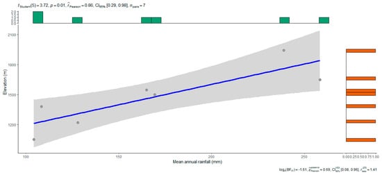 Correlation between mean annual rainfall and elevation. Green and orange represent frequentist analysis and bayesian analysis respectively. Shadow represents the correlation between elevation and mean annual temperature.