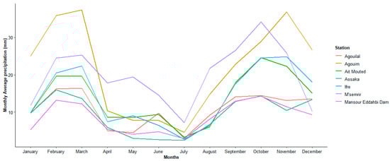 In contrast, those with elevated CV values are more susceptible to flooding. Moreover, Figure 5 illustrates the monthly average precipitation for the different stations. Results demonstrate that the highest monthly averages were recorded at Agouim (1647 m a.s.l), followed by M’semrir (1942 m a.s.l), then Ifre (1498 m a.s.l), and the lowest monthly average was recorded at Masour Eddahbi Dam (1050 m a.s.l). These monthly averages also exhibit very significant differences throughout the year. Figure 5 shows that July is the least rainy month for all stations. It is noticeable that the average rainfall is less than 10 mm for all stations and reaches its maximum at M’semrir (7.14 mm). The average rainfall during boreal summer is also less than 10 mm for all stations except for M’semrir (21.71 mm) and Agouim (14.79 mm). It is also noticeable that the common characteristic of most stations is a period of dryness in the summer, extending from April to August and sometimes to September (Figure 5).