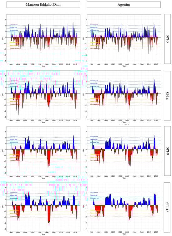 Results indicate that Mansour Eddahbi Dam witnessed nine significant dry periods and eleven wet periods, while Agouim encountered eight dry years and fourteen wet periods throughout the study period. The most significant drought period in Agouim corresponds to the peak SPI-12 (−2.82, July 2001), from October 2000 to March 2002, representing 18 months with a severity of 19.87 in Agouim. Conversely, SPI-12 (−3.13, June 2001) from September 2000 to February 2002 represents 17 months with a severity of 29.76 in Mansour Eddahbi Dam. Additionally, Agouim has maximum SPI-3 (2.511), SPI-6 (2.63), SPI-9 (2.55), and Mansour Eddahbi Dam has maximum SPI-3 (2.53), SPI-6 (2.74), SPI-9 (2.42) in November 2014. However, SPI-12 (1.924) was in January 2015 in Agouim, while SPI-12 (2.181) was in December 1989. Confirming these insights, it is noticeable that 2001 was the driest year for most stations, while 2014–2015 had the strongest floods. These findings align with the outcomes of previous studies [,,].