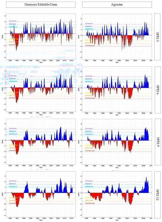 Figure 7 reveals that the temporal evolution of drought calculated using SPEI follows the pattern of SPI. However, compared to SPI, SPEI identified more drought events that were more severe. SPEI identified a multiyear severe drought in 1982–1986 and 2001–2003 in the Mansour Eddahbi Dam and Agouim stations, although the magnitude of the drought severity is greater in Agouim than in Mansour Eddahbi Dam.