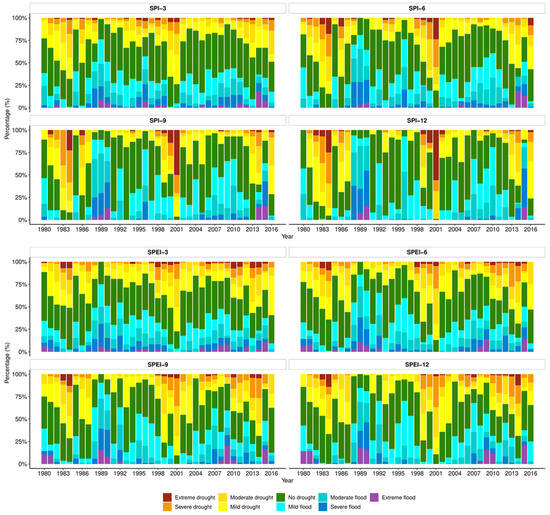 Figure 8 shows the temporal evolution of different drought classes for the SPI and SPEI, as categorized in Table 1. The results show severe drought in 1981–1984, 2000–2001, and 2013–2014, with 2001 being the driest year during the study period. Over 75% of both SPEI and SPI values returned drought during this period. The results show moderate and mild drought was the dominant drought category for any dry year. Conversely, wet years were experienced in 1988–1990 and 2007–2010, with 1989 being the wettest year.
