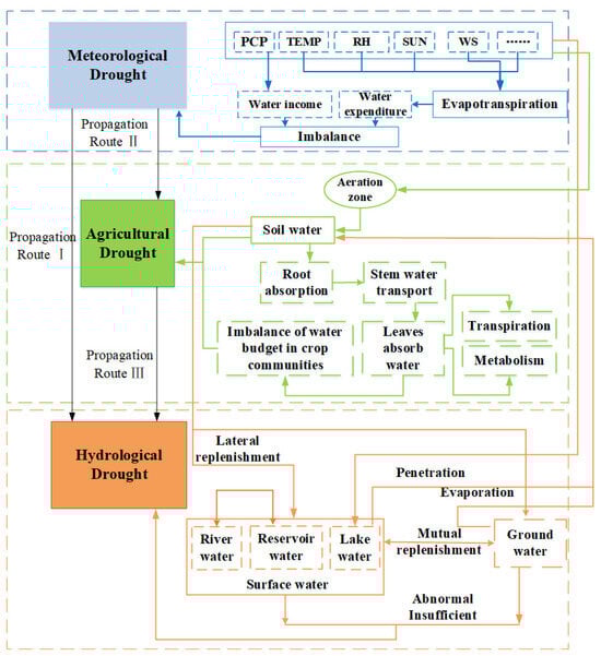 It is widely accepted that meteorological drought serves as the origin of other drought types, and the process by which meteorological drought triggers agricultural drought or hydrological drought is referred to as drought propagation [4,5,6]. Figure 1 de-picts the intricate interplay between meteorological drought, agricultural drought, and hydrological drought, where these phenomena both hinder and facilitate each other. Meteorological drought exacerbates the evaporation of water from the earth’s surface and shallow groundwater, leading to increased depletion of surface water and groundwater and directly initiating hydrological drought (referred to as propagation route I in Figure 1) [7]. Additionally, meteorological drought can directly induce a reduction in soil water content. Insufficient replenishment of soil water disrupts the crop water budget, resulting in decreased grain yield and subsequent agricultural drought (referred to as propagation route II in Figure 1) [8]. Prolonged agricultural drought leads to the desiccation and compaction of the aeration zone [9]. Consequently, even with the same level of precipitation, the replenishment of surface water and groundwater is diminished, thereby triggering hydrological drought (also referred to as propagation route III in Figure 1).