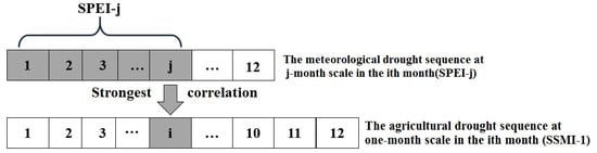 Drought propagation time refers to the lag between meteorological and agricultural drought, or between agricultural and hydrological drought. The Pearson correlation coefficient method is commonly used to measure the correlation between two variables, with values ranging from −1 to 1. The larger the value, the higher the correlation between the two variables [41]. The strongest Pearson correlation coefficient method has been widely used in recent studies to quantify propagation time [42,43,44,45]. For example, in the case of meteorological to agricultural drought, the approach is illustrated in Figure 3. The cumulative drought scale is defined from 1 to 12 months, and the correlation between meteorological and agricultural drought is maximized to determine the propagation time. Similarly, the lag between agricultural and hydrological drought is determined using the same method. Seasonal mean propagation times are calculated by averaging the monthly values. Overall, this correlation-based approach provides quantitative insights into the cascading effects of drought across meteorological, agricultural, and hydrological systems.