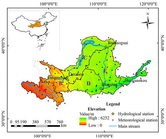 The Yellow River is the second largest river in China, with a drainage basin of 795,000 km2 and a main stem length of 5464 km. The climate exhibits significant variations due to the influences of atmospheric and monsoonal circulations. Precipitation exhibits substantial spatial heterogeneity, uneven seasonal distribution, and high interannual variability. The multiyear average annual precipitation is approximately 476 mm, gradually decreasing from southeast to northwest. Most areas experience high potential evapotranspiration, ranging from 800 to 1800 mm annually. Mean annual temperatures vary from −4 °C to 14 °C, increasing from northwest to southeast [46,47]. To comprehensively analyze the spatial propagation characteristics among meteorological, agricultural, and hydrological droughts, the YRB was delineated into six zones based on climatic regions, as shown in Figure 4. Detailed information regarding the climatic characteristics of each zone can be found in our previous research [40].