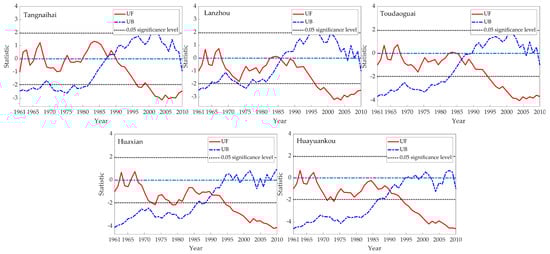 Detection of abrupt points of yearly naturalized runoff from 1961−2010 at the five hydrological stations in the YRB.
