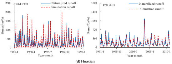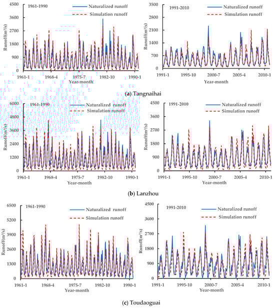 Figure 6 presents the monthly simulated and observed runoff time series from 1961–1990 and 1991–2010 across five hydrological stations (Tangnaihai, Lanzhou, Toudaoguan, Huaxian, and Huayuankou) in the YRB. Visual inspection shows close agreement between the modeled and measured monthly runoff dynamics for both periods at all stations, indicating that SWAT accurately captured the observed runoff patterns.