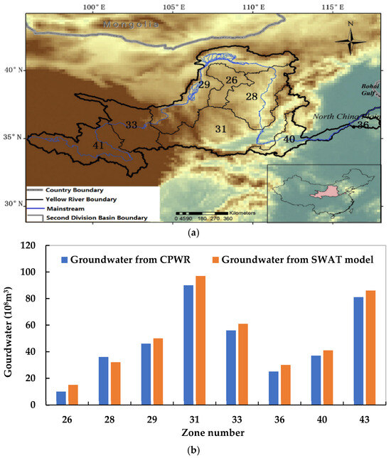 (a) Zone numbers of second division sub-basin, and (b) comparison of groundwater from CPWR and SWAT model.