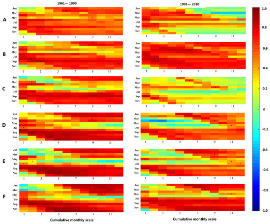 The correlation coefficient between meteorological drought at 1–12 month cumulative scale and agricultural drought at 1-month scale in the YRB (note: A is the semiarid-to-semihumid region. B is the transitional zone between plateau and mid-temperate climates. C is the arid-to-semiarid region. D is the semiarid region. E is the semiarid-to-semihumid zone. F is the humid region).