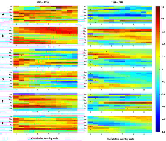 Figure 10 exhibits the correlation coefficient between agricultural drought at cumulative scales of 1 to 12 months and hydrological drought at a 1-month scale in the YRB. The color scheme represents the strength of the correlation coefficient, with redder shades indicating higher coefficients and bluer shades representing lower coefficients. The small black points indicate the most robust correlation coefficient between hydrological drought and agricultural drought at the corresponding cumulative scale of the month. These points essentially indicate the propagation time from agricultural drought to hydrological drought within the month, corresponding to the cumulative monthly scale shown on the horizontal axis.