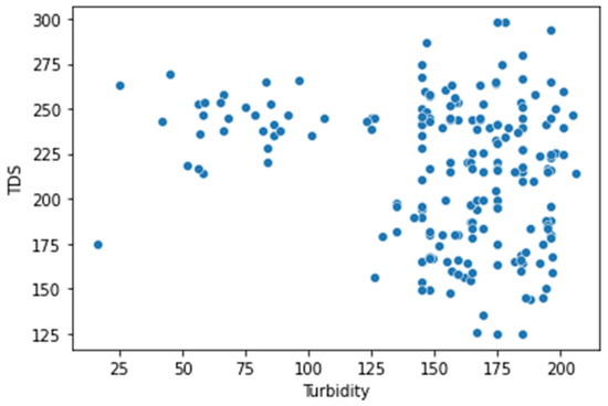 Figure 6). Turbidity is the cloudiness or haziness of the water brought on by suspended particles, whereas TDS is the quantity of dissolved solids in the water. An outlier or other anomaly in the data can be found using a correlation graph. It may be a sign that there are additional variables influencing the link between TDS and turbidity, such as the presence of pollutants or other contaminants, if, for instance, most of the data points on the graph follow a distinct pattern but a small number of points fall outside of this pattern.
