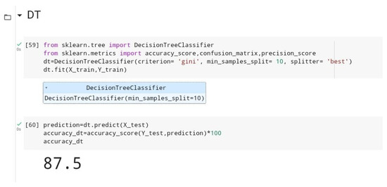 Figure 9). After that, it descends the tree to the following node and bases its judgment on a different characteristic. The projected class or category is represented by a leaf node, which is reached by continuing this procedure. For classification problems in machine learning, decision tree classifiers are an all-around effective and flexible tool. They may offer important insights into complicated datasets and are applicable to a wide range of tasks, such as forecasting consumer behavior and identifying medical disorders. The