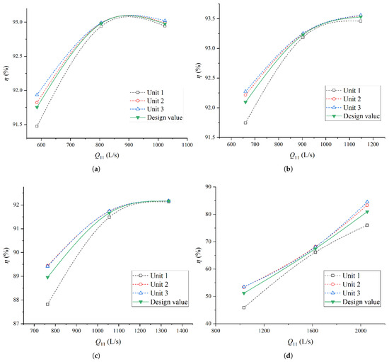 - Based on the relationship curve between unit efficiency and unit flow, the estimated efficiency values of the three units on the left bank under different water level conditions are obtained through interpolation. It can be found that due to the uneven distribution of flow in the upstream reservoir area, the efficiency of Unit 1 is significantly lower than the design value under the same water level and inflow conditions, especially when the efficiency drops by more than 5% under low water level conditions.