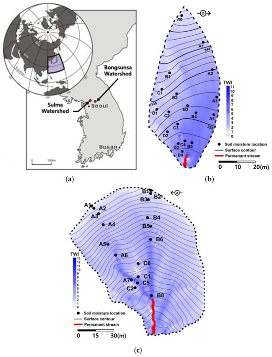 - Kim, S. Characterization of annual soil moisture response pattern on a hillslope Bongsunsa Watershed, South Korea. J. Hydrol. 2012, 448, 100–111. [Google Scholar] [CrossRef]