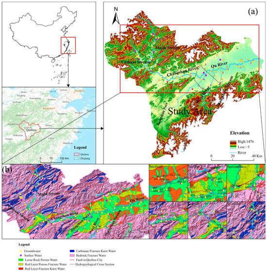 As one of the pioneering sites of the “Green Waters and Green Mountains are Gold and Silver Mountains” initiative, the water quality of the Qujiang River Basin has garnered national attention. Consequently, more stringent standards have been proposed for water resource exploitation, management, environmental protection, and ecological preservation. The Qujiang River serves as a substantial surface water resource for Quzhou City, characterized by its abundant total volume but low per capita availability. Its spatial distribution does not align with cultivated land, population, or economic development. Additionally, the geological strata of the Qujiang basin are diverse, including various formations spanning different geological eras, from the early Paleozoic to the Cenozoic.