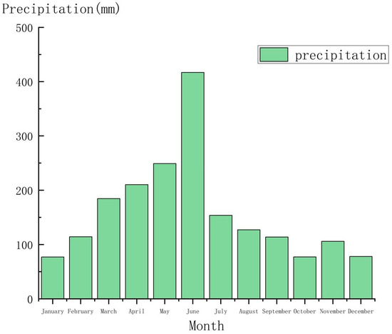 The study area experiences a subtropical monsoon climate, characterized by pronounced seasonal variations, including extended summers and winters, short-lived springs and autumns, abundant sunshine, and unevenly distributed precipitation throughout the seasons. The average annual temperature in the region hovers around 17.5 °C, with recorded extremes ranging from a high of 41.2 °C to a low of −10.4 °C. Based on data from seven hydrological rainfall stations situated in and around the study area, coupled with information from eleven meteorological stations in Kecheng District spanning the past decade, the multi-year average precipitation amounts to 1908.04 mm. The highest annual recorded precipitation occurred in 2015, reaching 2890.2 mm at the Qilipai Station, while the lowest was observed in 1979, with 1109.3 mm at the Quzhou Station. Detailed rainfall data are presented in Figure 2.