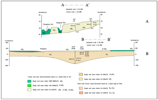 Concerning the aquifer medium and storage conditions, the dominant groundwater types in the study area comprise unconsolidated rock pore groundwater and clastic rock of the red bed type, which includes both pore and fracture water, along with bedrock fracture water. The upper sections of the red bed clastic rock frequently display the presence of unconsolidated rock pore groundwater. Specific hydrogeological features can be seen in Figure 3.