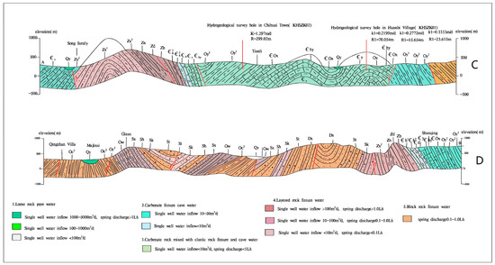 Hydrogeological cross-section of the study area, with (A,B) representing the upper reaches and (C,D) representing the middle and lower reaches.