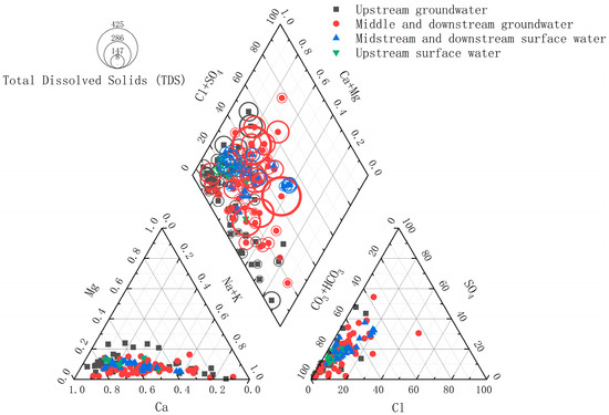 Piper trilinear diagram representing groundwater and surface water in the Qujiang River Basin.