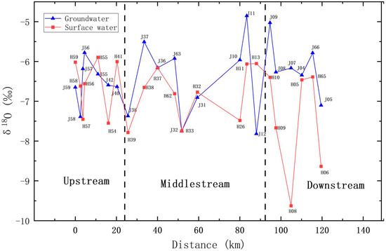 Based on the spatial distribution data of hydrogen and oxygen isotopes within the research area, we observed a notable trend in the δ18O values of surface water in the upstream portion, specifically from the Chi-huai River to the Majin River. These values tended to increase in the direction of the river flow. This rise can be attributed to the ongoing evaporation that occurs during the water’s transportation, resulting in isotopic enrichment. In the middle reaches of the watershed, particularly in the Changshan River section, numerous tributaries converge, contributing surface water with a relatively lower δ18O content. This infusion causes a sudden decline in δ18O values. Nevertheless, the overarching pattern still indicates an enrichment of δ18O values along the course of the river (Figure 8).