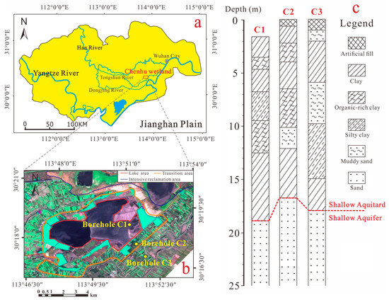 The geographic location and lithologic profiles of the study area. (a) Location of Chen Lake wetland in the eastern part of JHP. (b) Locations of boreholes C1, C2, and C3 in Chen Lake wetland. (c) Lithologic profiles of three boreholes.