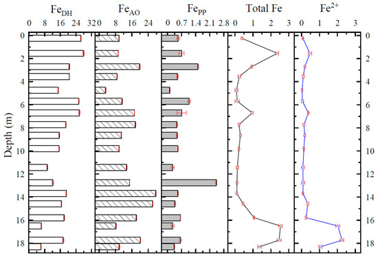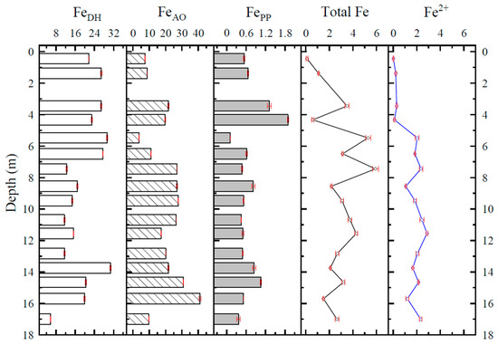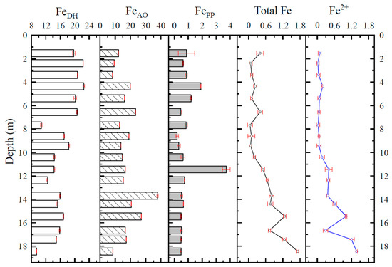 According to the test results, the average values of the basic physicochemical indicators of sediment and pore water at different depths are listed in Table 2. The variation in concentrations of Fe oxides in sediment samples and total Fe and Fe2+ in pore water samples with depth is shown in Figure 2, Figure 3 and Figure 4.