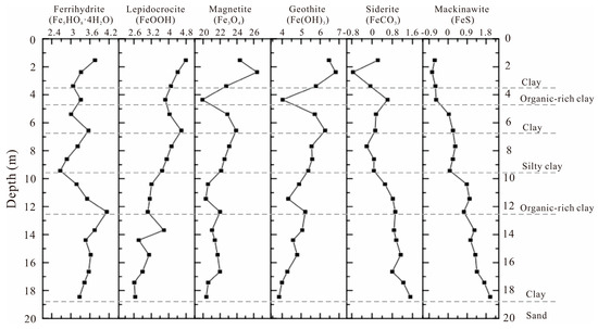 In the shallow oxidative environment (−3.5–0 m), the saturation indices of ferrihydrite and lepidocrocite decreased with depth, while the saturation indices of magnetite and goethite initially increased with depth, indicating the occurrence of Fe crystallization. Poor crystalline Fe (III) transforms to a highly crystalline state via (1) dissolution and recrystallization: the hydroxyl-Fe ions such as Fe(OH)+ and Fe(OH)2+ produced by ferrihydrite dissolution, polymerize, and precipitate transform to crystalline Fe (hydrogen) oxides. (2) Internal solid-phase transformation also occurs: the rearrangement of atomic structures in ferrihydrite’s crystal structure is accompanied by dehydration or dehydroxylation [43]. The saturation indices of magnetite and goethite both decreased after entering the reductive environment in the first organic-rich clay layer (−4.7–−3.5 m), which could be related to the dissimilatory reduction in Fe (III) induced by a high OM content. However, the saturation indices of ferrihydrite and lepidocrocite did not change significantly, possibly because they absorbed other chemicals to form a closed storage structure and inhibit the dissimilatory reduction. In the second clay layer (−6.8–−4.7 m), due to the high background contents of FeDH and FeAO (Figure 2), the saturation indices of Fe (III) minerals all increased with depth. Below −6.8 m, the saturation indices of lepidocrocite, magnetite, and goethite all decreased with depth, indicating that both poorly crystalline and crystalline Fe oxides were reduced, resulting in an enrichment of Fe2+ in pore water with depth. In the second organic-rich clay layer (−12.5–−9.5 m), the saturation index of ferrihydrite gradually increased with depth, corresponding to the high content of FePP and indicating that it might combine with OM.