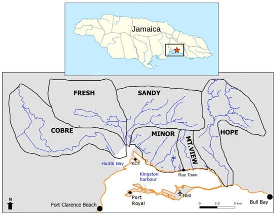 The study area encompasses the metropolitan area of Kingston and parts of Spanish Town; it is bounded southward by the Caribbean Sea and in all other directions by the hill range surrounding the city (Figure 1). The study area of the coastal assessment extends from Fort Clarence Beach on the west [17°54′35″ N, −76°53′14″ E] to Bull Bay on the east [17°56′35″ N, −76°40′2″ E] and includes the Palisadoes sand strip where NMI is located. In the urban flood risk assessment, the study area is divided into six catchments: three rivers (Hope, Rio Cobre, and Fresh) and three artificial gully systems (Sandy Gully, Mountview Gully, and “Minor” gullies). The “Minor” gullies system comprises six short channels running N-S from Kingston downtown to the sea that are grouped due to data availability and resolution issues (Figure 1). The Palisadoes sand strip is not included in the urban flood assessment as it does not have any water catchments.