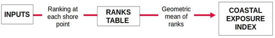 Flow chart graphically summarizing the key steps for calculating the Coastal Exposure Index. For each shoreline segment, input data (Figures S1–S4) are ranked 1–5 according to their increasing contribution to exposure. The geometric mean of the ranks is then taken to calculate the final Coastal Exposure Index.