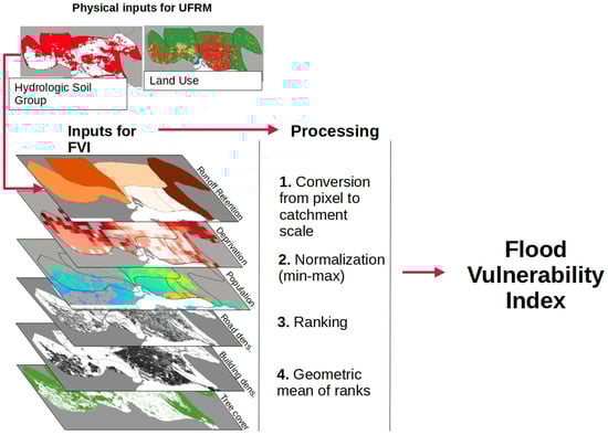 Urban flood risk was assessed at the catchment scale. The six catchments were delineated using the digital elevation model (Figure S2) of the study area as a guideline, with the streams and gullies identified through OpenStreetMap [57]. For each catchment, an FVI was calculated from both physical and socio-economic exposure parameters (Table 3). A schematic summary of the methodology followed to compute the FVI is shown in Figure 3.