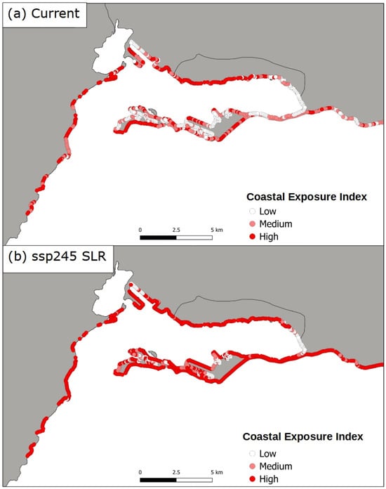 Figure 4 shows the distribution of the Coastal Hazard Index along the Kingston shoreline under different SLR scenarios and assuming current habitats extent. In the current scenario, the highest exposure was found in downtown Kingston, Hunts Bay, and on the seaward side of Port Royal (Figure 4a). In contrast, the lowest exposure was observed on the harbour side of the Palisadoes tombolo and on the eastern side of Kingston harbour. A sharp increase (104%) in the number of coastline segments showing high exposure was found in the future scenario (Figure 4b), in which all the studied coastline is highly exposed except for the eastern side of Kingston harbour and some points along the harbour side of Palisadoes.