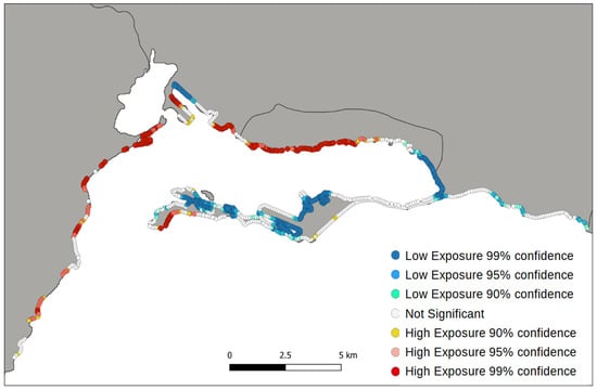 Subsequently, a hotspot analysis was applied to the index to discern the spatial significance of the generated exposure values [49]. The results of this exposure assessment will be utilized to qualitatively evaluate coastal flood risk, drawing upon the existing literature on Kingston’s coastal vulnerability.